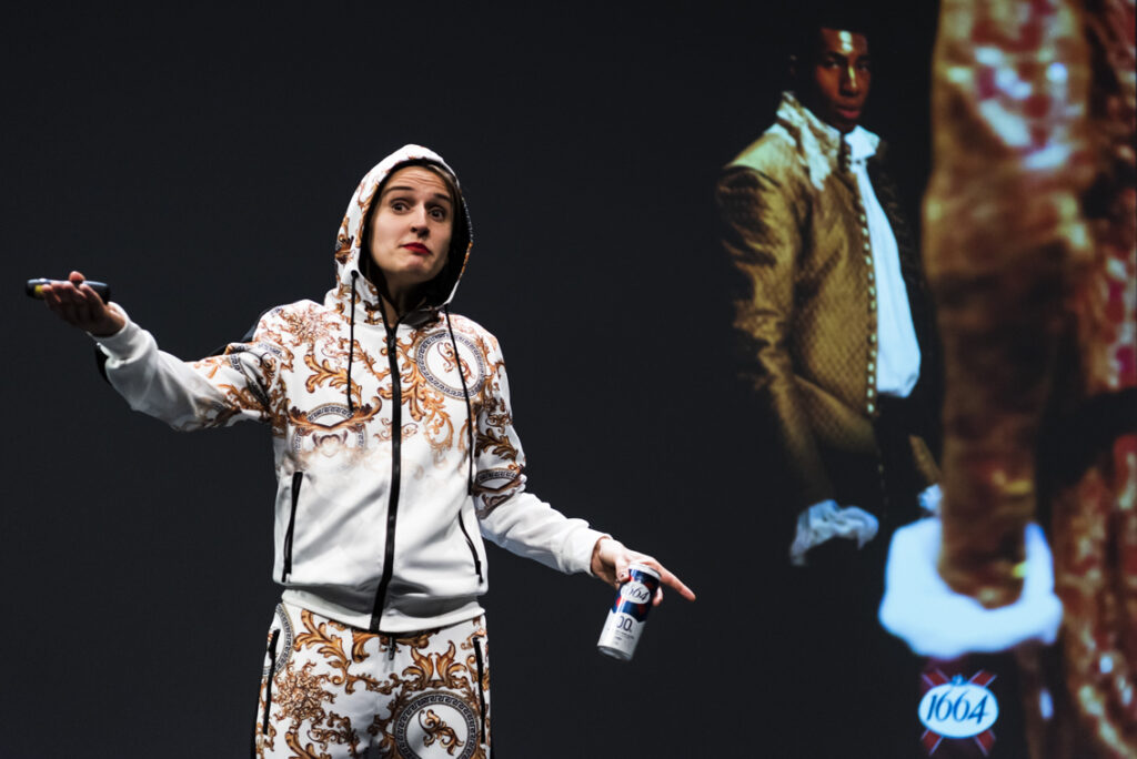 Chez Hortense Belhôte, cet art permanent de la digression nous donne à voir une quête de connaissance filtrée par le prisme d’une conscience en train de se former, et en l’occurrence une conscience queer, féministe, artistique. La conférence spectaculaire est aussi un seule-en-scène, une réflexion sur un parcours de vie qui nous pousse à choisir un médium plutôt qu’un autre : sous quel mode transmettre les savoirs et pourquoi ? Qu’est-ce que cela change de s’éloigner d’une méthode universitaire, d’un certain rapport à la connaissance pour privilégier la subjectivité, les ponts improbables, l’incarnation, l’humour, et un ensemble de références absolument non hiérarchisé, qui va de chercheur·euses très sérieux·ses à la pop culture ? Hortense Belhôte finit par créer avec nous un langage : tous les éléments même les plus incongrus finissent par tisser ensemble un réseau de références communes avec le public. On rentre dans la tête de l’artiste, là où il n’y a plus de système dominant de production du savoir, mais un joyeux bordel tout aussi opérant. C’est intelligent, drôle, touchant et généreux, c’est une œuvre de service public.