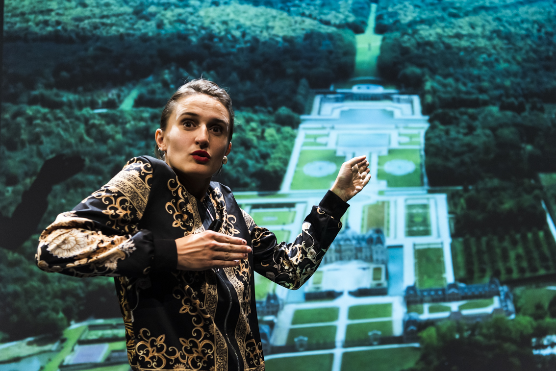 Hortense Belhôte nous accueille en salle, circulant parmi le public dans sa tenue de non-prof, plutôt comme une sportive prête pour le marathon. C’est vrai que ces spectacles sont de vrais tours de force, une heure de plateau tambour battant dans une proposition hybride qui mélange les codes. L’artiste s’est forgé ce nom de « conférence spectaculaire », qui porte bien son nom : en dialogue avec d’autres formes qui renouvellent le cadre de la conférence (conférence performée, « conférences gesticulées » de Franck Lepage), les spectacles d’Hortense Belhôte assument leur cadre d’origine. L’adresse est frontale, il y aura un grand powerpoint projeté pendant tout le spectacle, activé avec une télécommande, et il s’agit avant tout d’explorer un sujet de manière exhaustive, même si tous les outils sont évidemment subvertis – le powerpoint est truffé de photos personnelles, de blagues, de montages volontairement douteux et mal découpés, de superpositions en collage qui donnent à voir tant le fourmillement d’un esprit au travail que les différentes strates qui s’activent lorsqu’on plonge dans un sujet.
