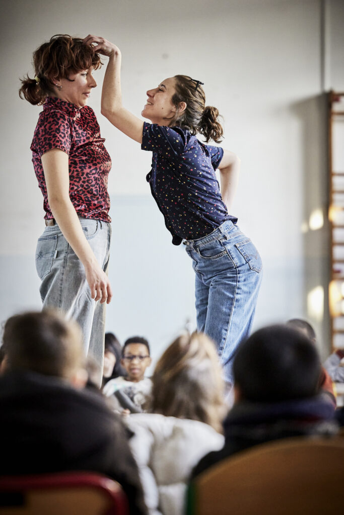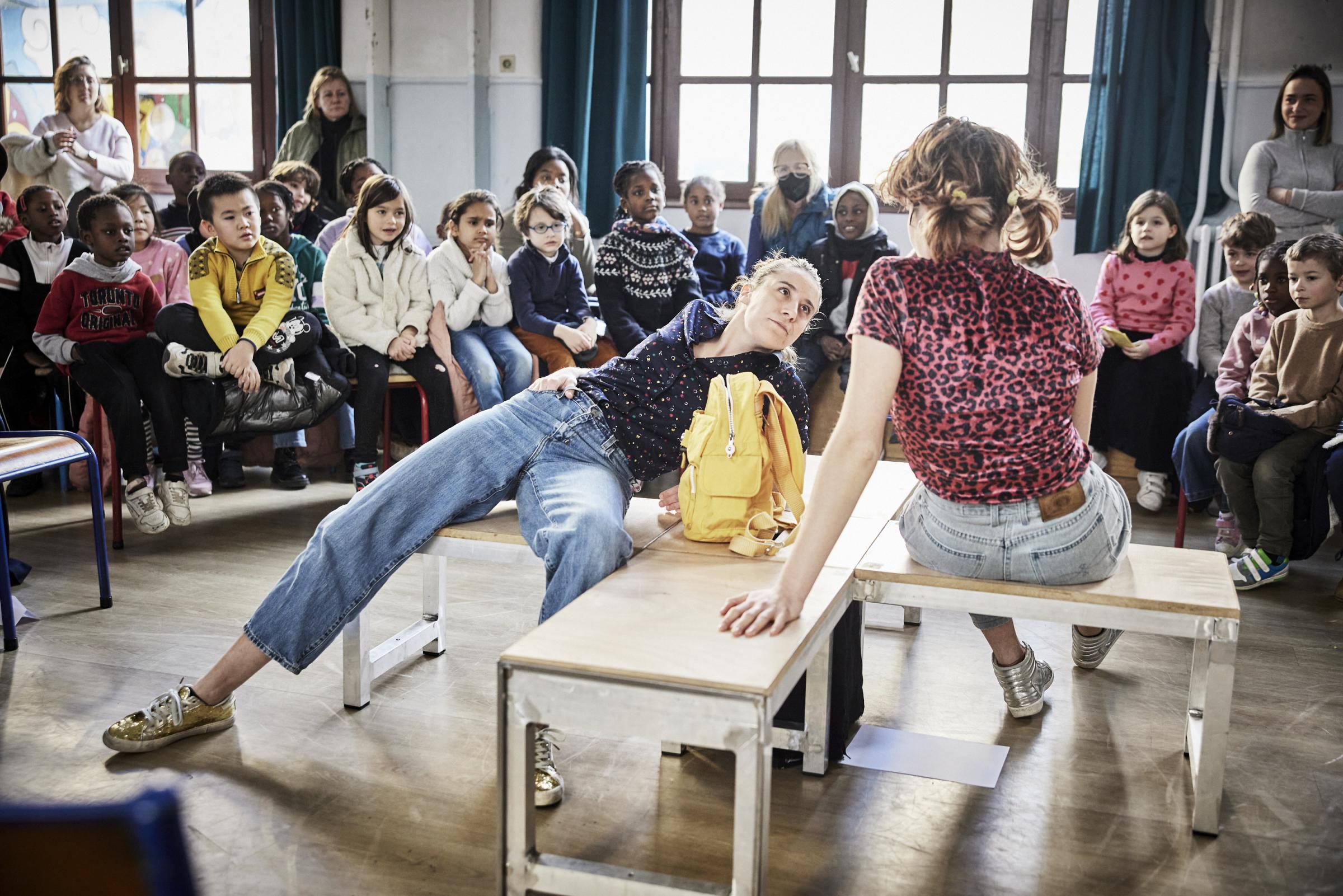 Dans le studio du théâtre Sarah Bernhardt, les enfants s’installent joyeusement. Iels sont venu·es en famille, ou bien avec leur centre de loisirs, leurs classes. Les sièges sont disposés en quadri frontal, les adultes, placent les enfants : on met les plus petit·es devant, les plus grand·es derrière, aux extrémités et à certaines places stratégiques on place quelques adultes. Puis on redonne des consignes aux enfants : respecter le travail des comédiennes (déjà au plateau) on explique la fine ligne entre participer et perturber. Après ces multiples consignes de sécurité, tout le monde est prêt à faire décoller l’objet théâtral pour un voyage de 50 minutes.