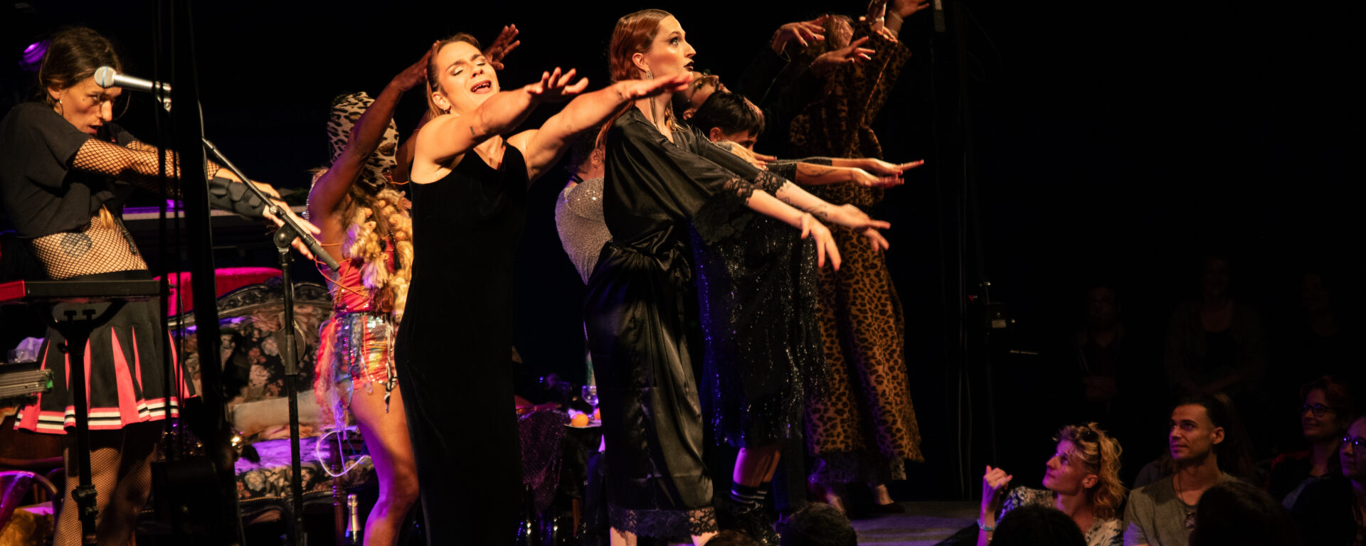 À travers la structure d’apparence classique d’un enchaînement de numéros, ces artistes complet·es, qui ont le culot d’être doué·es en tout, rivalisent d’ingéniosité dans la démonstration de leurs capacités physiques et musicales. Sur un plateau-podium, sangles aériennes, drag, contorsion, fakirisme, effeuillage, lip-sync ou encore trapèze se succèdent devant nos yeux ébahis. Des tableaux-merveilles qu’iels ont construit avec minutie, avec toujours ce sens accru de la surprise : on ne sait jamais ce qui nous sera réservé. Le bal s’ouvre d’ailleurs avec l’ingénieuse métamorphose de Mamie Mercédès/Andrea, qui troque sa robe de chambre et ses clémentines pour un strip-tease aérien et burlesque, au son cinglant du fouet qui claque.
