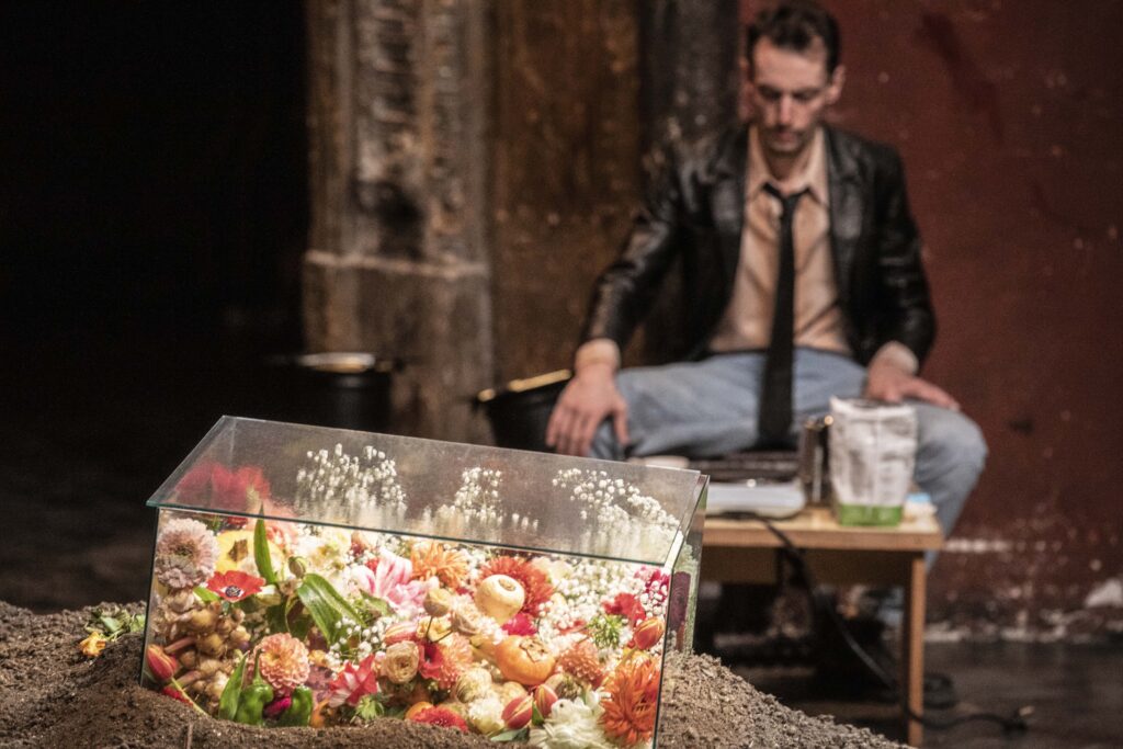 Une immense motte de terre, comme si on avait recouvert un corps. Des fleurs, colorées, déjà fanées, sous verre. Un monticule sur lequel seront déposées d’autres fleurs, mais aussi des lettres, des carnets, autant de souvenirs égrainés. Mais rien de mortuaire ici, que de la joie, que de la vie, même dans la perte, même dans la douleur. L’amour est mort ? Vive l’amour ! Huit acteur·ices-personnes-personnages sont ici, sur la toujours splendide scène du Théâtre des Bouffes du Nord, pour nous parler d’amour, de l’amour vécu, de l’amour cherché, de l’amour trouvé, de l’amour perdu, de l’amour manqué et du manque d’amour, des amours plurielles, orageuses et sacrées, du désamour, bref de toutes les formes, de toutes les possibilités, de tous les horizons de l’amour.