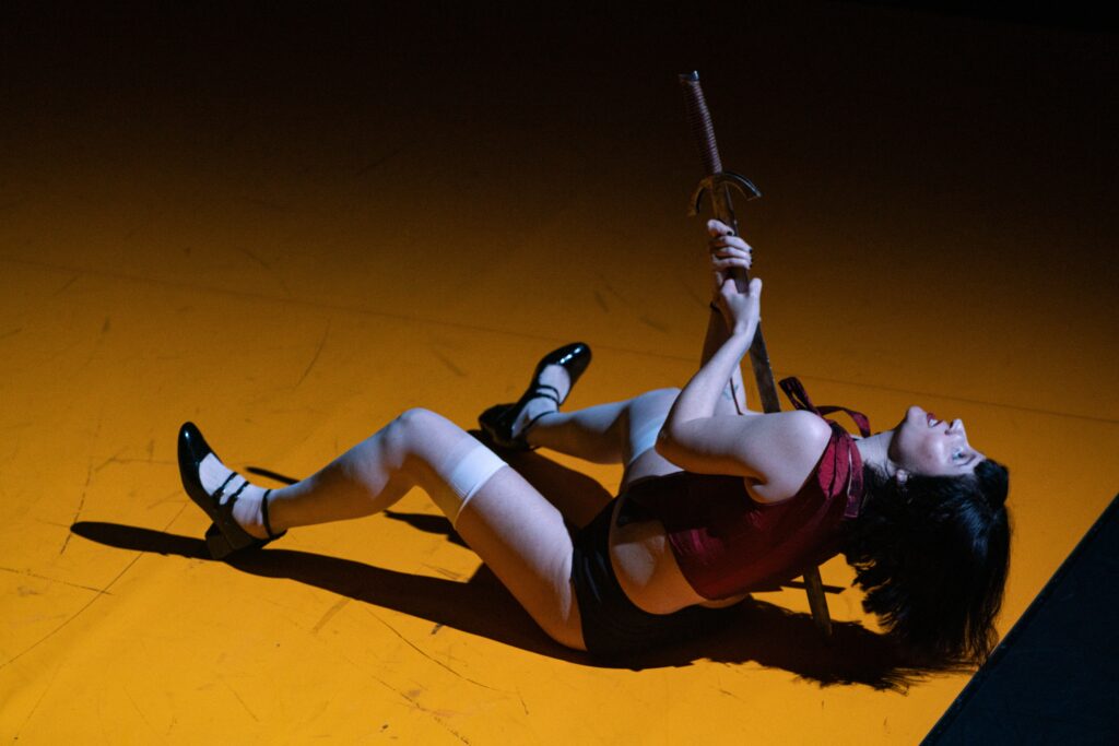 Le tour de force de l’autrice s’impose dans la perspective comique qui accompagne ses interprétations. La distance n’est pas l’apanage habituel des performances, pourtant ici Carolina Bianchi parvient à opérer un double regard sur ce qu’elle propose : l’humour nous saisit de manière inattendue et imagée. Les ressorts qu’elle utilise sont à la fois provocateurs et subtils : pousser l’admiration que l’on porte aux génies jusqu’à se masturber sur une interview de Kantor, l’auto-dérision avec la figure du Master qui commente —et décrédibilise— l’action sur scène via un texte projeté, et on retiendra surtout cette scène d’anthologie de l’INTERVISTA.
